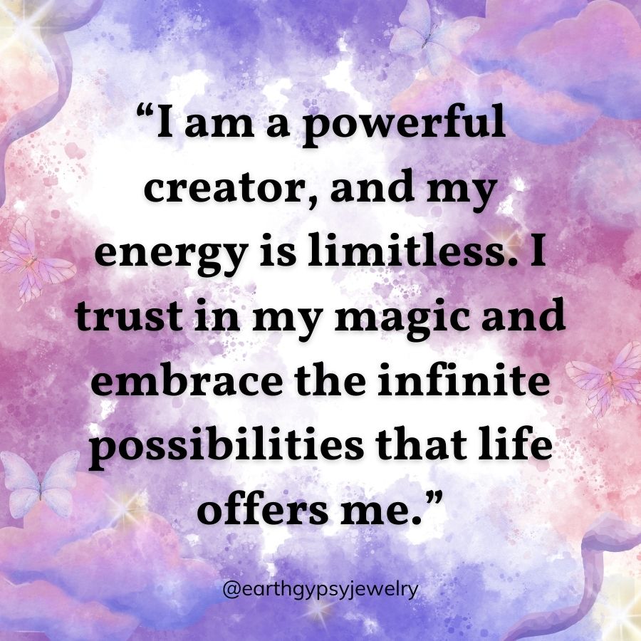 "I am a powerful creator, and my energy is limitless. I trust in my magic and embrace the infinite possibilities that life offers me."
